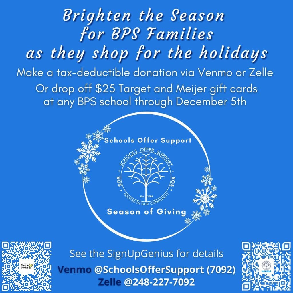 SOS is collecting monetary donations and $25 Meijer and Target gift cards through December 5th. Get all the details on how to make your tax-deductible donation via Venmo or Zelle or how to donate gift cards at the link.