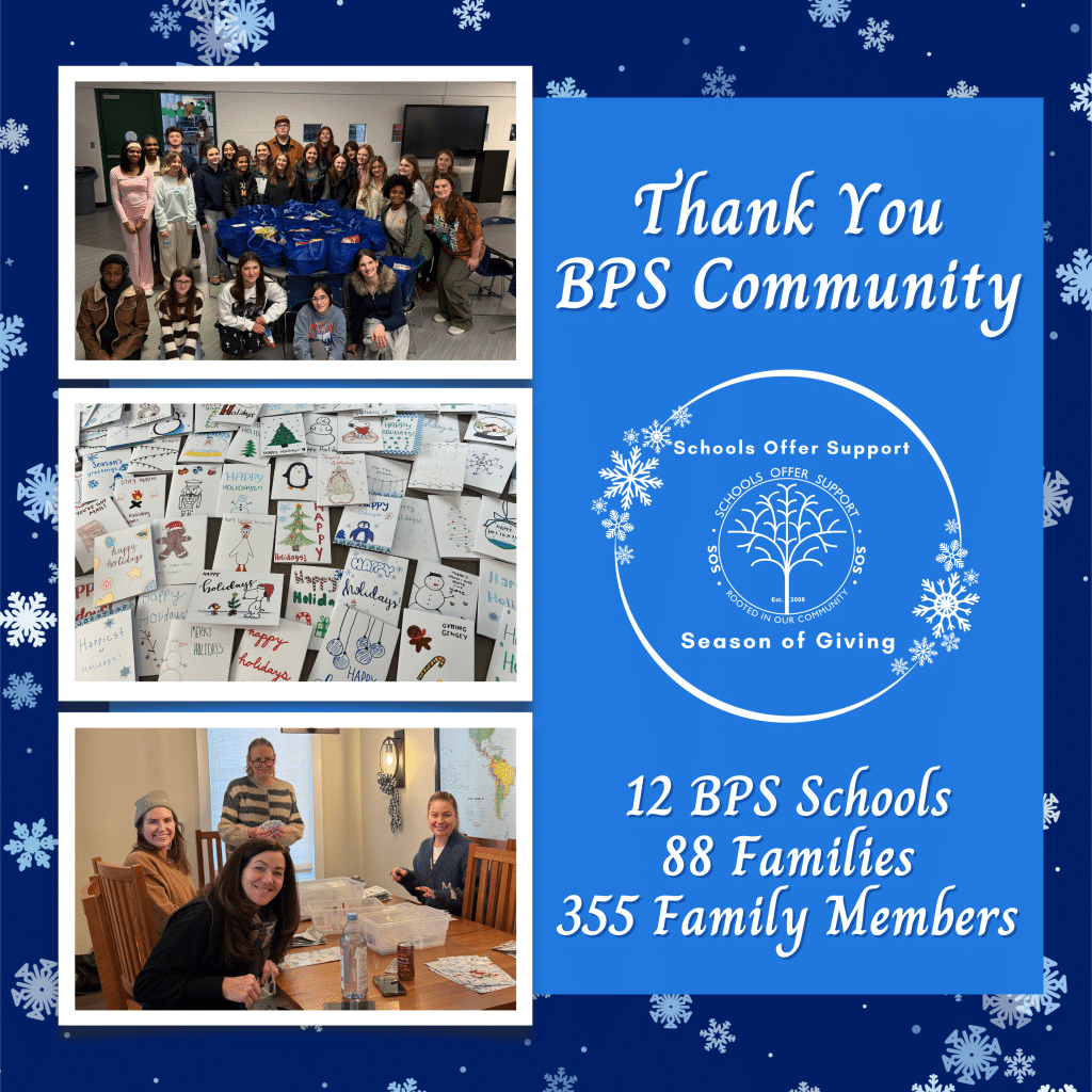 Thank you, BPS Community! Through your generosity, SOS was able to provide Target and Meijer gift cards and non-perishable food bags for 88 families to help brighten their holidays.